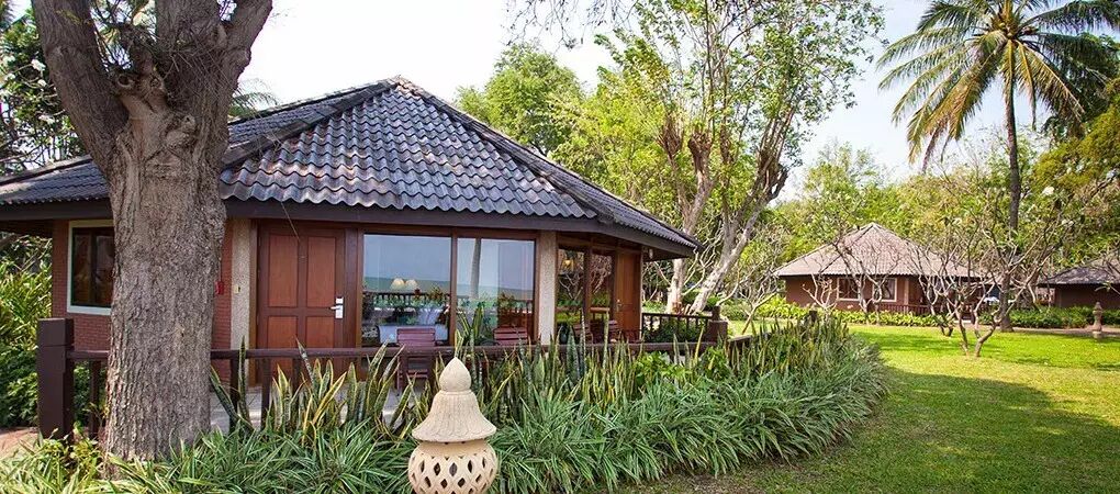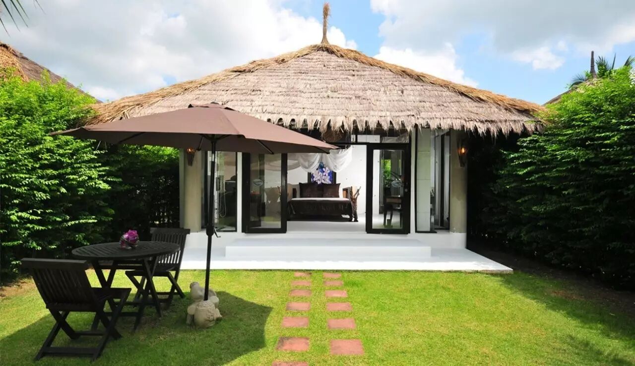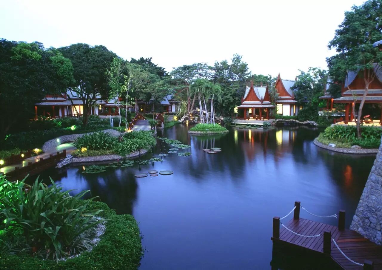 酒店的四周树阴浓密,145间外形宛如民宿,内在奢华高雅的客房被分散在五片区域内。建筑物与别墅之间以林间小径相连接,并以大大小小40多座池塘和游泳池穿插其中。穿过长长的林阴,就到了别墅区。每一栋别墅都是独门独院的小楼,木制小门给人温馨的感觉,满院的鸡蛋花则传来阵阵幽香。
