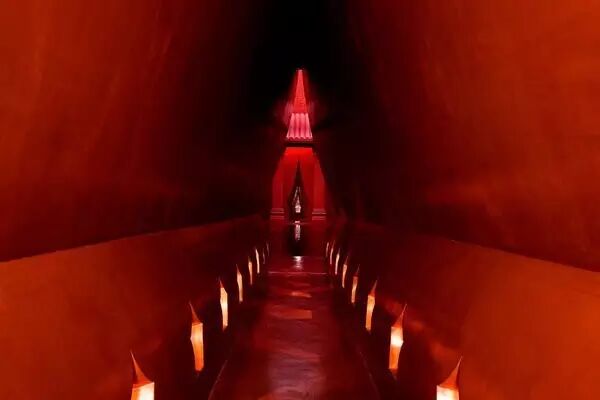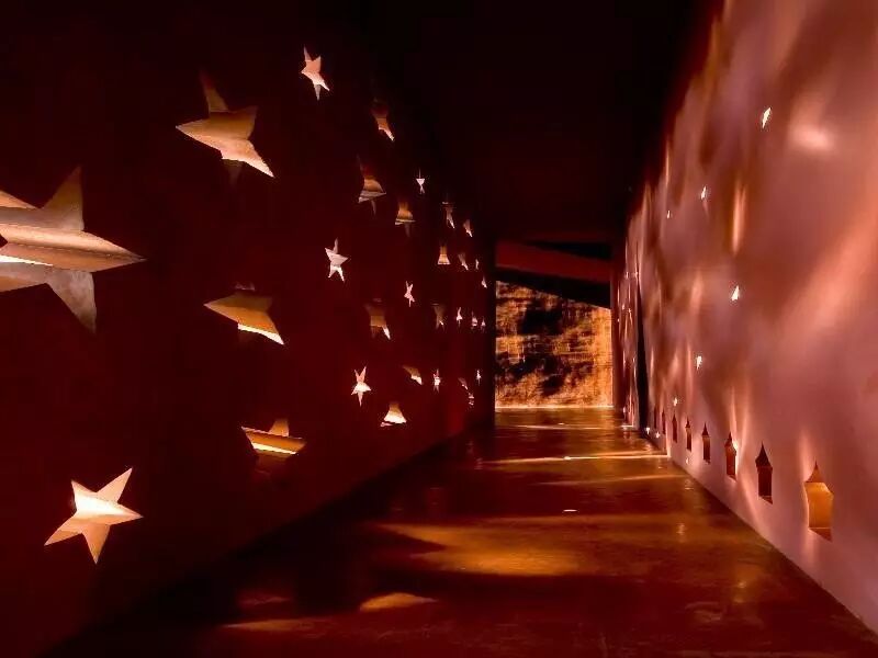 Spa的入口是一条幽暗的长廊,砖红色的墙体上被设计师凿出无数个星形的洞,阳光从墙洞中洒了进来,有一种寂静且神圣的感觉。而通过一天里光线的明暗变化,整条长廊宛若一条如幻似真的星光隧道,尤其是下午日落余晖时的景致更美。