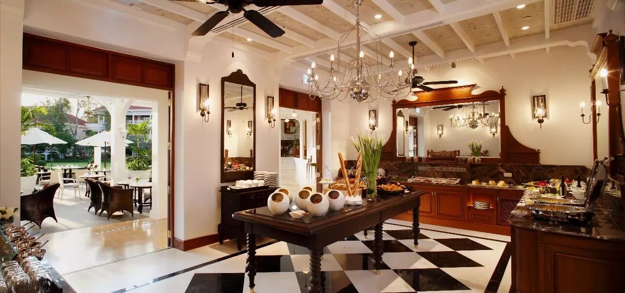 多年前的酒店大堂和前台如今被改造成了咖啡厅,在这里,你能看到老旧的电话机被摆放在一旁,墙上挂着泰国皇室以及酒店设计师的照片。咖啡厅的一角被变幻为一个小型的博物馆,老旧的玻璃柜中展示着酒店主人从欧洲各地旅游搜集回来的餐具、器皿和一些装饰品。